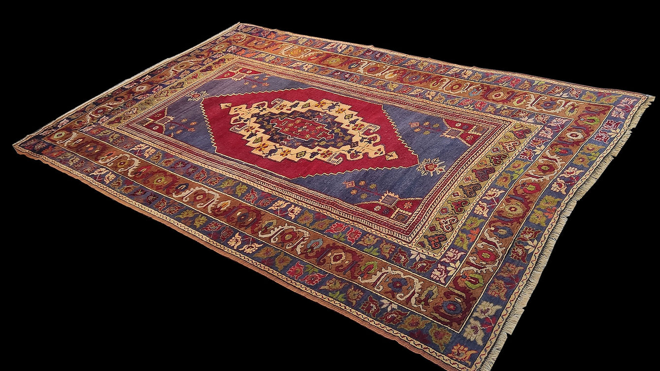 Tappeto turco Anatolia, annodato a mano e di forma rettangolare, 272x163 cm. Il campo blu lavanda è impreziosito da un grande medaglione esagonale rosso centrale, con un ulteriore medaglione geometrico interno avorio e rosso. L'intera superficie è riccamente decorata da motivi geometrici stilizzati e floreali, che si estendono anche nel vasto bordo. Quest'ultimo, in tonalità marrone e giallo-ocra, presenta una successione di riquadri con motivi floreali e un bordo esterno blu con fiori stilizzati, conferendo un aspetto robusto e tradizionale.