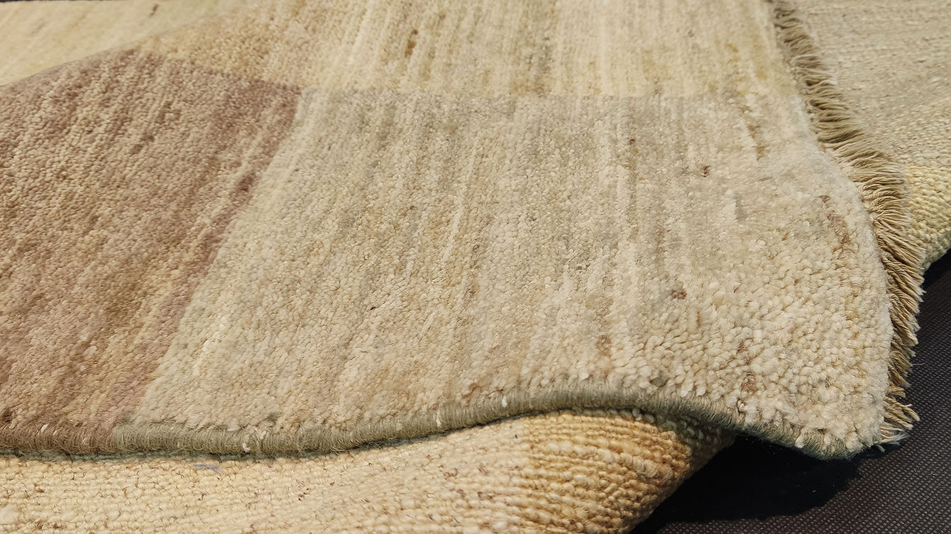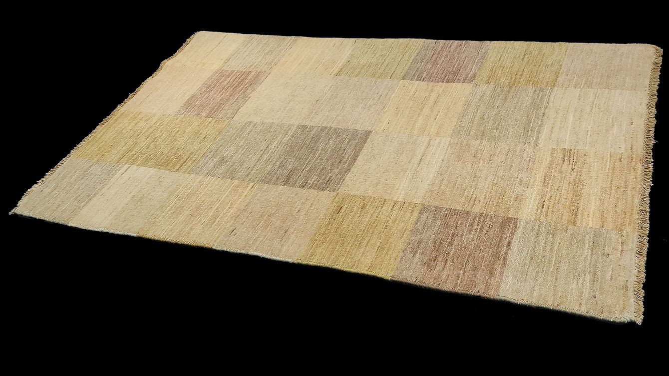 Tappeto Gabbeh super annodato a mano e di forma rettangolare, 155x92 cm. Il tappeto presenta un fondo con un motivo a blocchi di colore che creano un effetto patchwork. Le tonalità utilizzate sono principalmente beige chiaro, con variazioni che includono sfumature di beige più scuro, marrone chiaro e verde salvia, disposti in un pattern di grandi quadrati e rettangoli. Il bordo è rifinito con un filato dello stesso colore predominante del tappeto, e presenta frange chiare a una delle estremità.